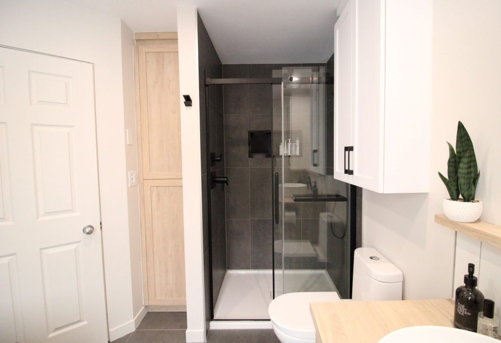 Cette petite salle de bain a subi une transformation radicale, permettant désormais l’installation d’une douche en céramique pour mieux répondre aux besoins de la famille. Une rénovation réussie avec des carreaux de céramique 24×24 au sol et dans la douche, apportant une touche moderne et épuré, tandis que le dosseret protège élégamment le mur de gypse, alliant fonctionnalité et design.